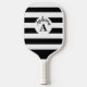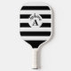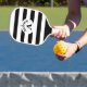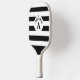 This sporty paddle features bold horizontal stripes in Black and white, creating a dynamic rhythm that suggests speed, clarity, and playfulness. At its centre, a round white emblem anchors the design, overlaid with elegant cursive text and a monogram-style element. The handle boasts a textured white grip for comfort and control, while the overall layout combines personal flair with clean aesthetics. Ideal for game lovers who value expression both on and off the court.