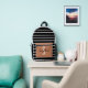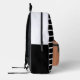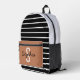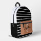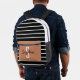 Stylish black and white striped backpack featuring a caramel front pocket with customisable name and initial. Perfect for school, travel, or daily use.