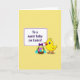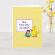 This card shows a sunny yellow little bird near the lower right, with big friendly eyes and a slightly open beak that feels like it’s chirping a sweet hello to someone special 🐰. Beside it sits a woven basket filled with decorated eggs in soft pastel pink, purple, blue, and yellow, including a few with gentle stripes that add a cozy, shared-celebration feel. A purple bow is tied to the basket, and short green grass with tiny blue flowers gathers around the base as if the bird is lingering there to keep a friend company 🌷. In the upper left, a rounded rectangular panel outlined in rich purple holds the greeting text, set neatly inside the frame for easy reading. The message is arranged in centered lines, standing out clearly against the light interior of the panel. A pale yellow background covers the whole scene, giving everything a warm spring glow without overpowering the details. The outlines are thick and simple, making the bird’s rounded shape and the eggs’ patterns easy to notice at a glance. The purple-framed text box sits above the basket, while the bird and eggs cluster together in the lower right against the pale yellow backdrop.