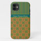 A chic Case-Mate case to personalise for your iPhone 5/5s, with a pattern of stylised Green Flowers, outlined in Navy Blue, on a Rusty Red Background, teamed with a matching striped pattern. Part of the Posh & Painterly "Jungle Drums" collection.