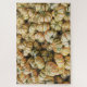 Colorful white gourds, striped and spattered with green, yellow and orange are piled in a market display.