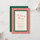 This holiday party invitation is simple yet festive and features a red and pink striped background with a dark green scalloped border. The design is perfect for inviting guests to your Christmas, New Year's, or winter celebration.