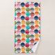 This towel set has a pink washcloth, a berry hand towel, and a bath towel with a mid-century modern design of striped semicircles and solid semicircles put together on a field of white.