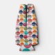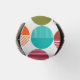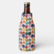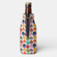 This bottle cooler has a mid-century modern design of striped semicircles and solid semicircles put together on a field of white.