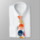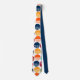 This necktie has a mid-century modern design of striped semicircles and solid semicircles put together on a field of white.
