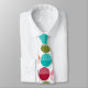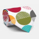 This necktie has a mid-century modern design of striped semicircles and solid semicircles put together on a field of white.