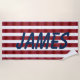 Series, of Abstract planks, stacked to form, wide stripes, in fading shades of, red, pink, blue, and black, against white, background-with your choice of Monogram, in Navy-blue.
