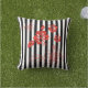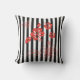 This outdoor throw pillow is shown in a cute black and white stripes and red tropical flowers print.