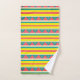 Towel Set with pink, yellow, white and blue stripes and blue and yellow triangles.
