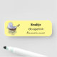 This badge looks professional and it's in keeping with my branding. The magnetic attachment is strong and stays in place all day. The quality of the materials and the colors were exactly as pictured. I couldn't be happier! The printing is clear and easy to read