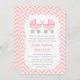 An elegant and classy twins baby shower invitation for mothers to be who are expecting a pair of baby girls. It features pink strollers with polka dots pattern. The strollers handles are creatively arranged to form a heart shape. Background of pink and white chevron background. Personalise easily with your party details.
