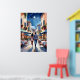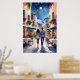 Poster of a couple walking hand in hand down a cobblestone street lined with café tables and flowers beneath a starry night sky. The warm glow from the windows and streetlamps creates a romantic, inviting atmosphere in this quaint European setting.