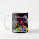 Classic white 11 oz. mug with an image, on both sides, of red, orange, yellow, green and blue paint splatters, high-top sneakers in neon colours, cassette tapes, colourful sunglasses and the text “Stuck in the 80s” in neon letters.