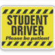 "Please be patient". Warn other drivers that there is a new driver on the road! Student Driver window decal sticker for New Drivers, Parents, Drivers Ed, Driver's Education road class or parents teaching thier 16 year old how to drive. Yellow hazard warning stripes with bold yellow and black text.