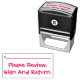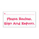 This playful rubber stamp design features the message "Please Review, Sign And Return.", plus a line where a signature or initials could be written above. It could perhaps be used by a teacher or an administrative professional to request that somebody review and acknowledge the contents of a document.