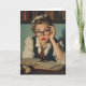 A young woman in vintage attire, wearing glasses, looks overwhelmed while studying at a desk filled with open books. The setting resembles a 1950s academic scene.