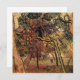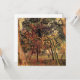 Study of Pine Trees by Vincent van Gogh is a vintage fine art post impressionism landscape nature painting. A forest with pine trees during the autumn season with beautiful colourful leaves on the ground. A man is walking in the distance.
