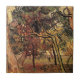 Study of Pine Trees by Vincent van Gogh is a vintage fine art post impressionism landscape nature painting. A forest with pine trees during the autumn season with beautiful colourful leaves on the ground. A man is walking in the distance.