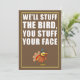 We'll Stuff The Bird, You Stuff Your Face funny Friendsgiving Invite featuring a cartoon turkey with a brown background. A great invite for inviting your friends for a Friendsgiving feast!