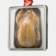 Stuffed roast turkey in roasting tray, close up metal ornament