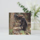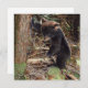 Painting of a black bear cub leaning against a tree while he stands on a moss covered stump and reaches for a flower.