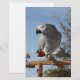 Pretty African Grey on a tree stand with her pretty grey feathers and red tail watching her surroundings outdoors against the blue sky and oak trees.