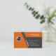 Design features an orange trapezium at the left wall with an underlying grey copy. Your elegant logo sits in this orange column with all your card info allocated with social media icons. Your contact details come first, followed by the emails and business address. Right above all this in a similar column sits your name and job title. All lettering are in white to accentuate the design. Moving over to the back, all your details are in a white background. At the midsection you have your optional logo ; if you opt to load a photo, the dimensions are 1,000 x 1,000 pix. Your business name, address and your tagline options follows suit. All items are customisable and you can choose to re-arrange the information.This is a great simple card, meant for use by all whose vocation is in programming and coding.
