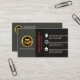 Business card with a 3 toned black shades background. It is set against a faux gold logo at the left side of the card alongside its business name. At the middle, you will find your prestigious name and position in a black column. The contact details are at the right side of the card placed in oversize buttons.