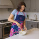 Designed for both beauty and everyday use, this apron offers comfortable coverage while keeping clothes protected from spills and splashes. The bold contrast of pink florals against the deep blue background creates a timeless look that feels both fresh and sophisticated—perfect for floral lovers and anyone who enjoys functional style.
