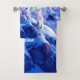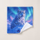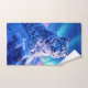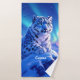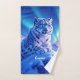 Add a supernatural touch to bath decor with this bathroom towel set, which features a majestic snow leopard with piercing blue eyes, its fur adorned with intricate patterns of frost and ice, as it perches atop a snow-capped mountain outcropping that's backlit by the setting sun and the aurora borealis. Personalise with a name!