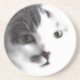 Stylised close-up stone coaster showing the beautifully expressive eyes and face of an adult white, brown, and grey mixed coloured cat.