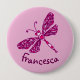 Beautiful stylised pink dragonfly art button/badge. Personalise with your own name, currently reads Francesca. Butterfly inked by Sarah Trett.