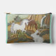 A brown horse accompanies a white unicorn as they stop at a stream with a waterfall in the distance. Unusual vegetation dot the landscape. This fantasy painting by my mother, Yee Wah Jung, was done in the "Tu-Aunqua" style, designed on tissue paper first in an outline, transferred onto paper backed silk fabric and then painted in oil. This term, seen in an exhibit brochure, may have been a rough phonetic translation of "labour table painting" from Chinese.