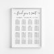Stylish downloadable wedding seating chart poster sign for up to 16 tables featuring "find your seat" in a chic script with swashes and your names and wedding date joined together by a heart in simple modern typography. The digital download option allows you to edit with last minute changes and print locally.