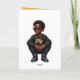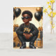 Celebrate with style! Our birthday greeting card features an illustration of a happy African American boy rocking a sparkly black and gold hoodie (with 'FLY' in gold), black jeans, and luxury sunglasses. He stands amidst big black and gold gift boxes, confetti, and balloons. Customise your special greeting on the back. Elevate the birthday vibes with this trendy card!