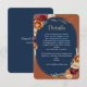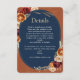 Stylish autumn orange navy floral wedding details Enclosure Card. Add a touch of elegance to your wedding suite with this stylish autumn details enclosure card, featuring rich orange and navy floral accents. Perfect for sharing important wedding information, this card beautifully complements your fall-themed celebration with its warm, sophisticated colour palette and modern design. Ideal for including directions, accommodations, or special details, it’s a chic and practical addition to your wedding stationery.