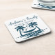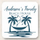 Stylish and lovely custom beach house plastic drink coasters for you home. Design is of 2 blue Palm trees and a Hammock, sea and birds. Beautiful personalized island home decor for your coastal themed cottage or guest house. All text can be customized then personalize with the family name and date. Matching items available