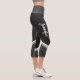 These black modern workout leggings feature an elegant white floral design on the waistband and on the legs with white stripes.