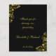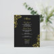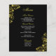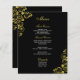 An elegant way to showcase your wedding menu to all your guests. A list showing the first course, second course and dessert options. The reverse has a personal message from you along with your names and wedding date. A dramatic black menu with faux gold foil swirls and flowers.