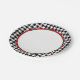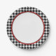 Stylish, preppy, and modern paper plates printed with a black and white houndstooth pattern, while the centre circle is white and outlined with red and black.