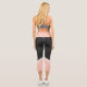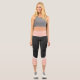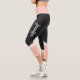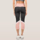 These black and light pink modern workout leggings feature an elegant white floral design on the waistband and on the legs with white stripes.