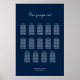 Help your guests find their table with this stylish blue seating chart. It is suitable for a wedding with 14 tables and 140 guests.
