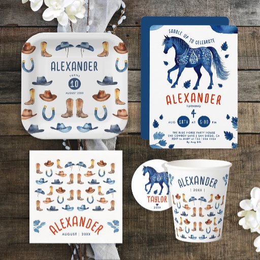 Get ready for an unforgettable adventure at our cowboy Wild West rodeo birthday celebration! The invitations feature a charming blue watercolor horse or pony design on a clean white background, adding a playful yet stylish touch to the event. The kids' name is showcased in a fun, bold red font, while the event details are easy to read in modern, sleek dark blue typography. Designed to be elegant and gender-neutral, this invite is perfect for both boys and girls. With customisable text, it’s the perfect way to make your invitation unique. Don’t miss out—personalise your invite and join the fun!