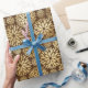 Beautiful and stylish wrapping paper features gold dahlias floral pattern on dark brown background.