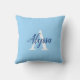 Stylish Calm Blue Monogram Script Throw Pillow featuring an elegant arrangement of name and monogram initial on a light blue background. The pillow is easy to personalise by typing the name and monogram initial of your choice into the online personalisation template before ordering. The text automatically copies across to the other side of the pillow to show the identical name and initial on each side.