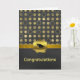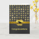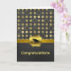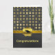 Stylish graduation greeting card, done in a trendy chalkboard grey and gold circle pattern, with a solid chalkboard grey, across the bottom of the card. Graphics of a gold tone ribbon, runs across the two backgrounds and is decorated with a gold wax looking seal, with a black graduate's cap. Golden graphic text reads Congratulations, on the front bottom of the card. Black text greeting, on the inside, is ready to personalise to read what you want.