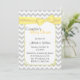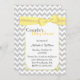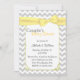 Stylish couple's baby shower invitation done in a light grey and white chevron zigzag pattern. Graphics of a pale yellow decorative edged white text area, in the middle, has a pretty pale yellow ribbon and bow, at the top. The backside is done in the same chevron pattern, with another white text area, at the bottom. Personalise all the text, front and back to suit your event needs.