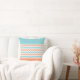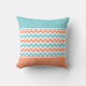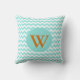 Stylish decorator throw pillow done with a different look on either side. The front has a coral, white, and aquamarine chevron zigzag pattern, running across the middle, with solid aquamarine on top, and solid coral colour, on the bottom of the pillow. The back is done in an aquamarine and white chevron pattern, with a large aquamarine circle, in the centre, with a bold coral coloured one letter monogram. Great for any room of the house or office.