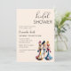 Modern and stylish Bridal Shower invitation featuring watercolor painting of three elegant, hourglass-shaped women wearing form-fitting and lightweight dresses of vibrant colours and patterns. Their hair styles and colour palettes differ and each carries a small backpack, adding a touch of casual charm to the scene.