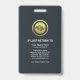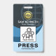 Colorful stylish blue shade waves are accentuated by an underlying global imprint at the top layer of the badge. Here lies an optional faux gold global city silhouette logo you can use. This is followed by your prestigious name, job title and a photo template to upload photos up to a size of 1,000 x 1,000 pix. Near to the base of the badge is a remarks caption "PRESS". You can change the caption to suit your needs. Just below this is the organization name.